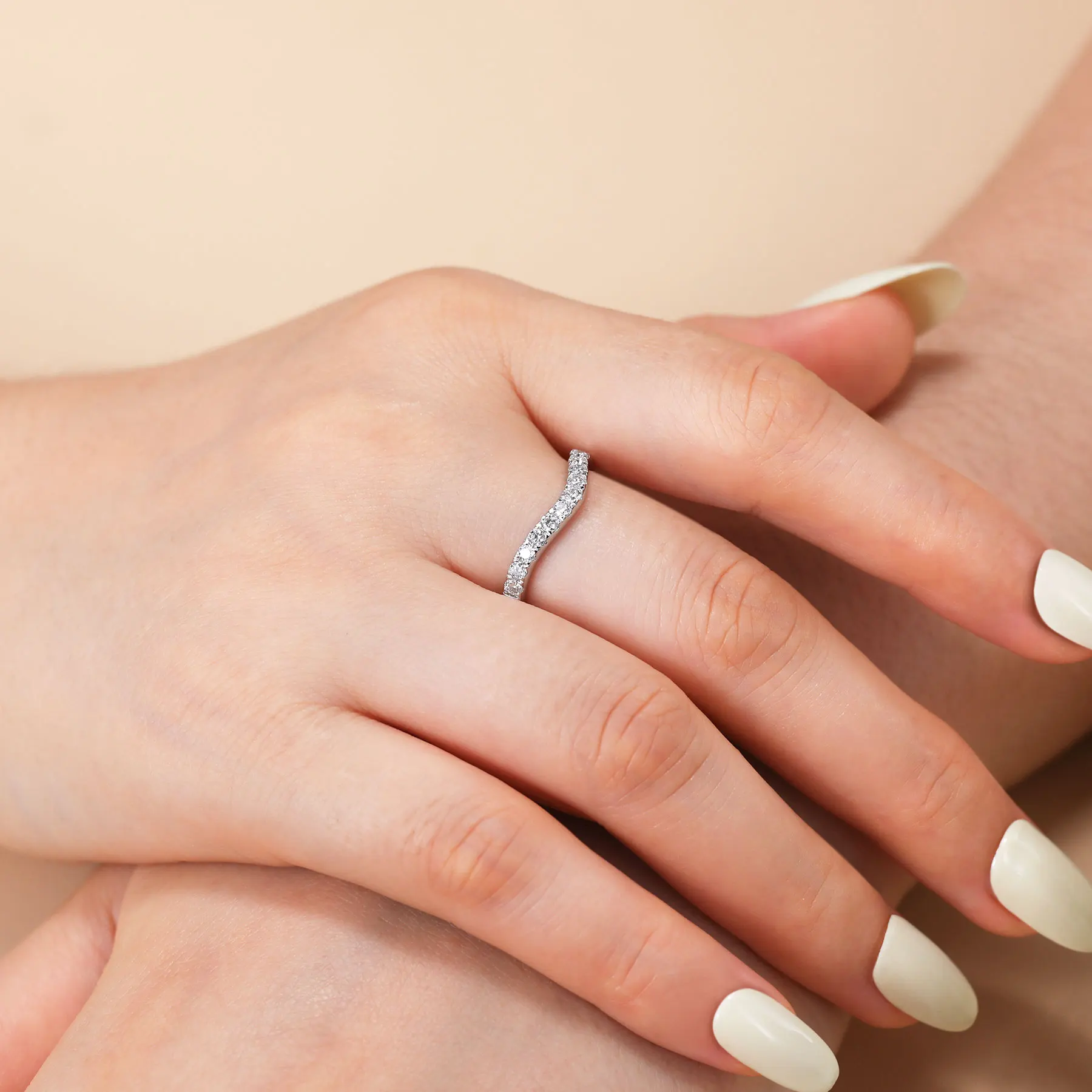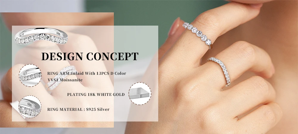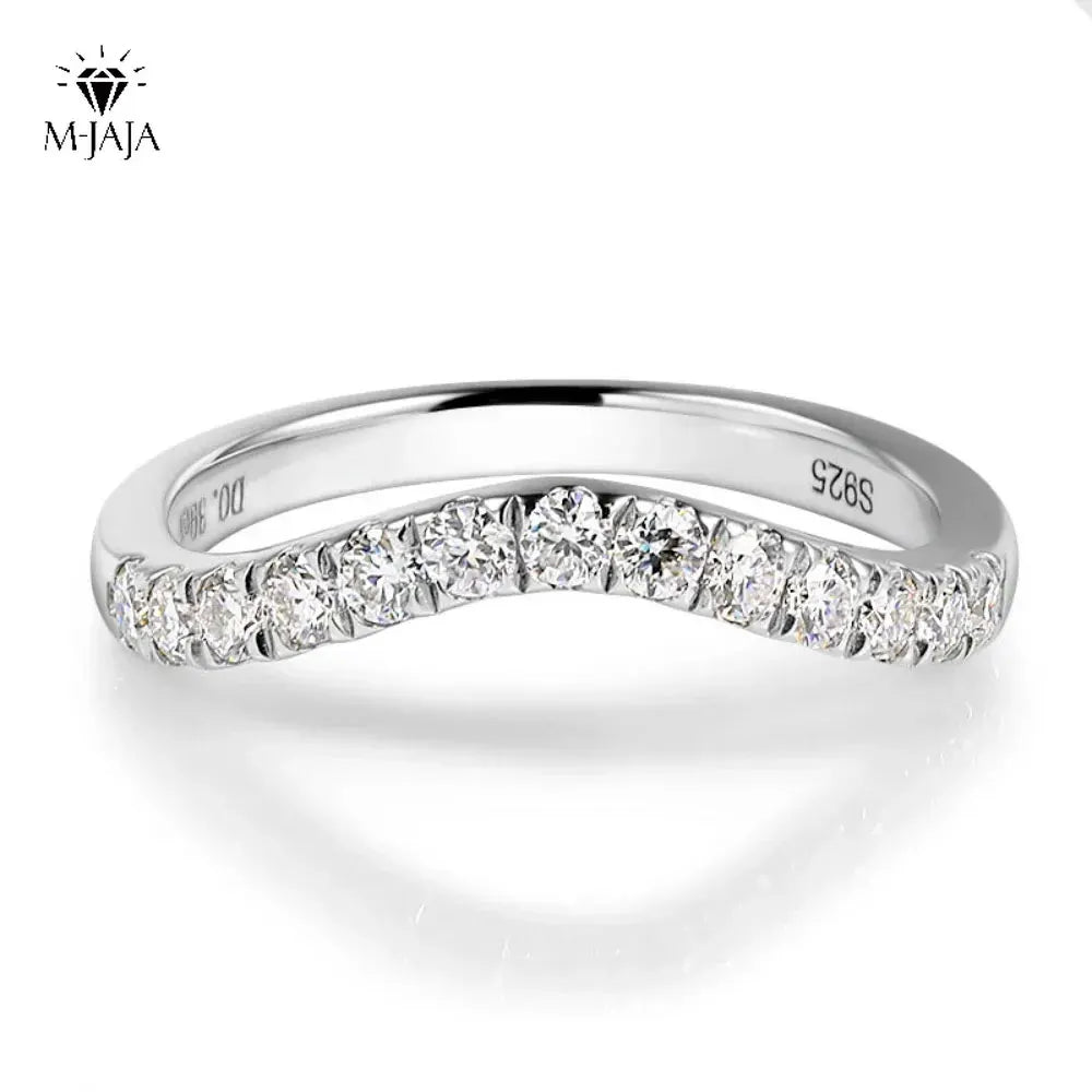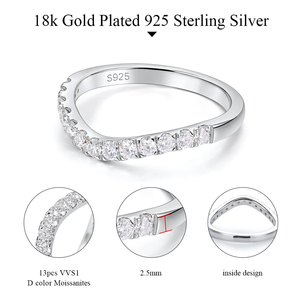 Crafted in S925 sterling silver, this half-eternity band features a delicate row of lab-grown moissanites (0.39 ct, D VVS1 grade) that gracefully contour the finger. Its subtle curve offers optimal comfort while creating a captivating play of light.